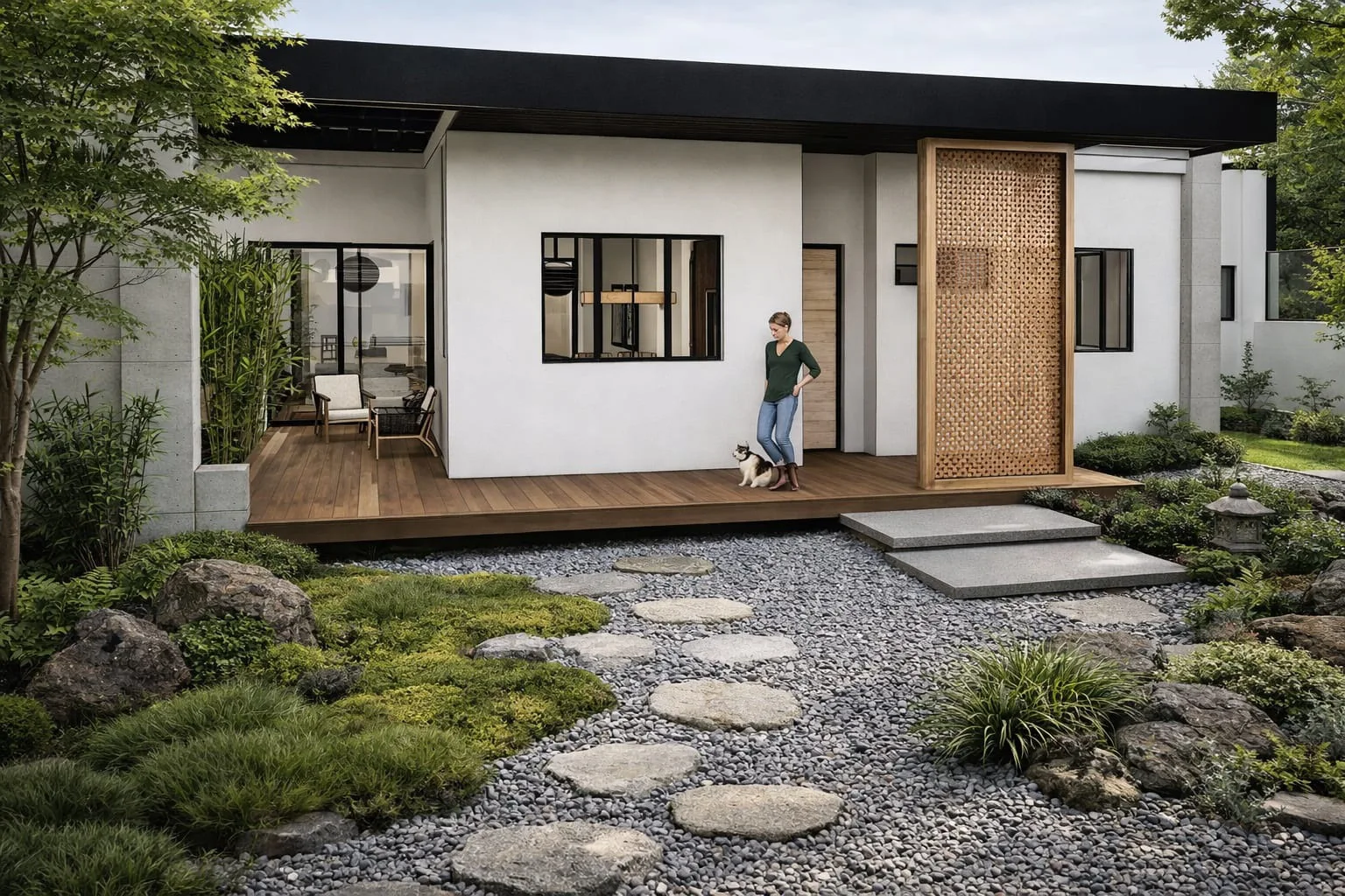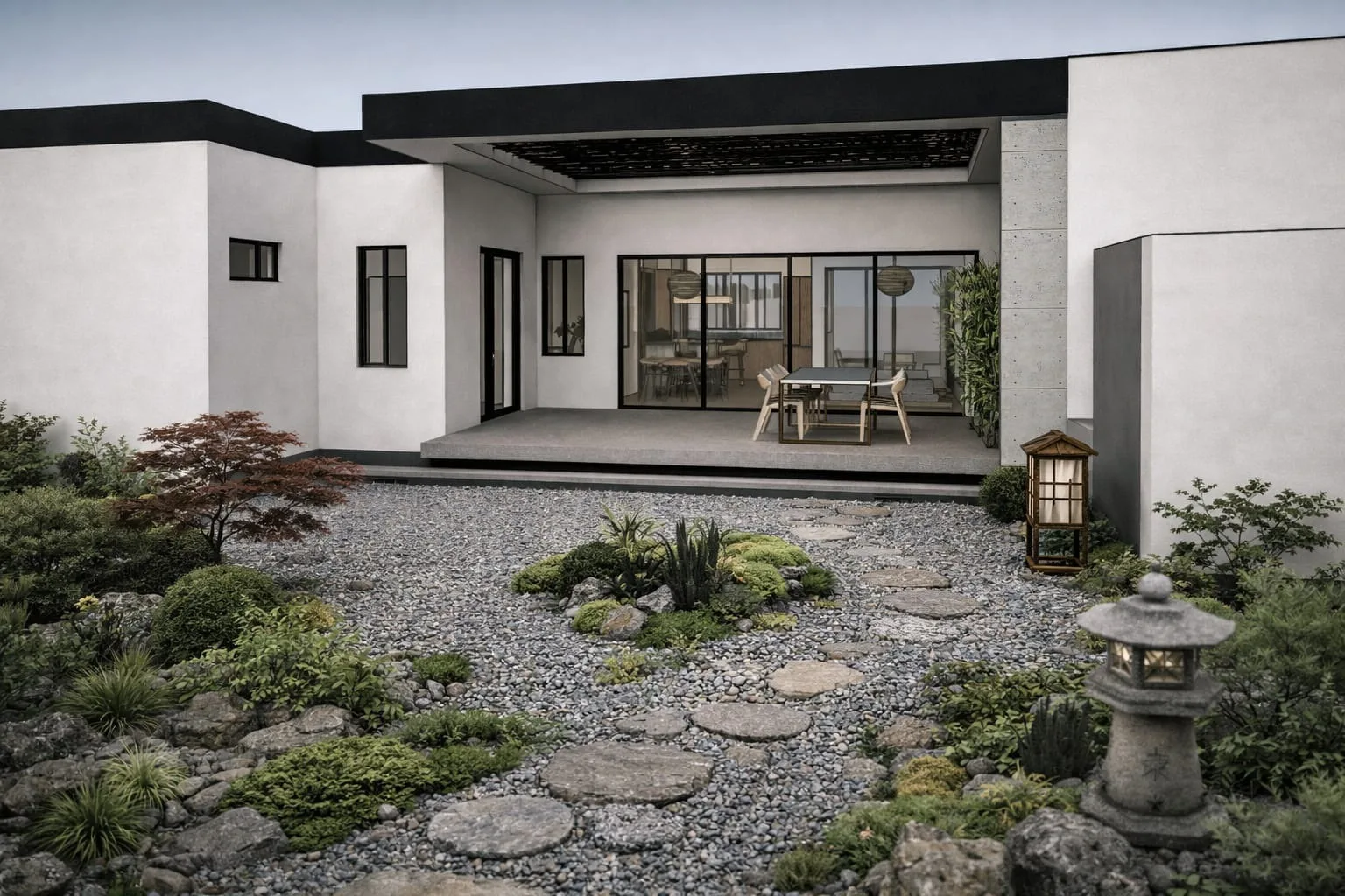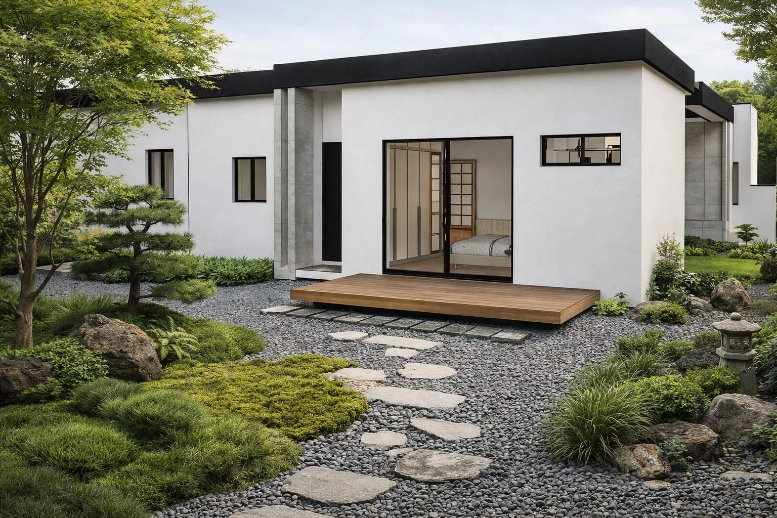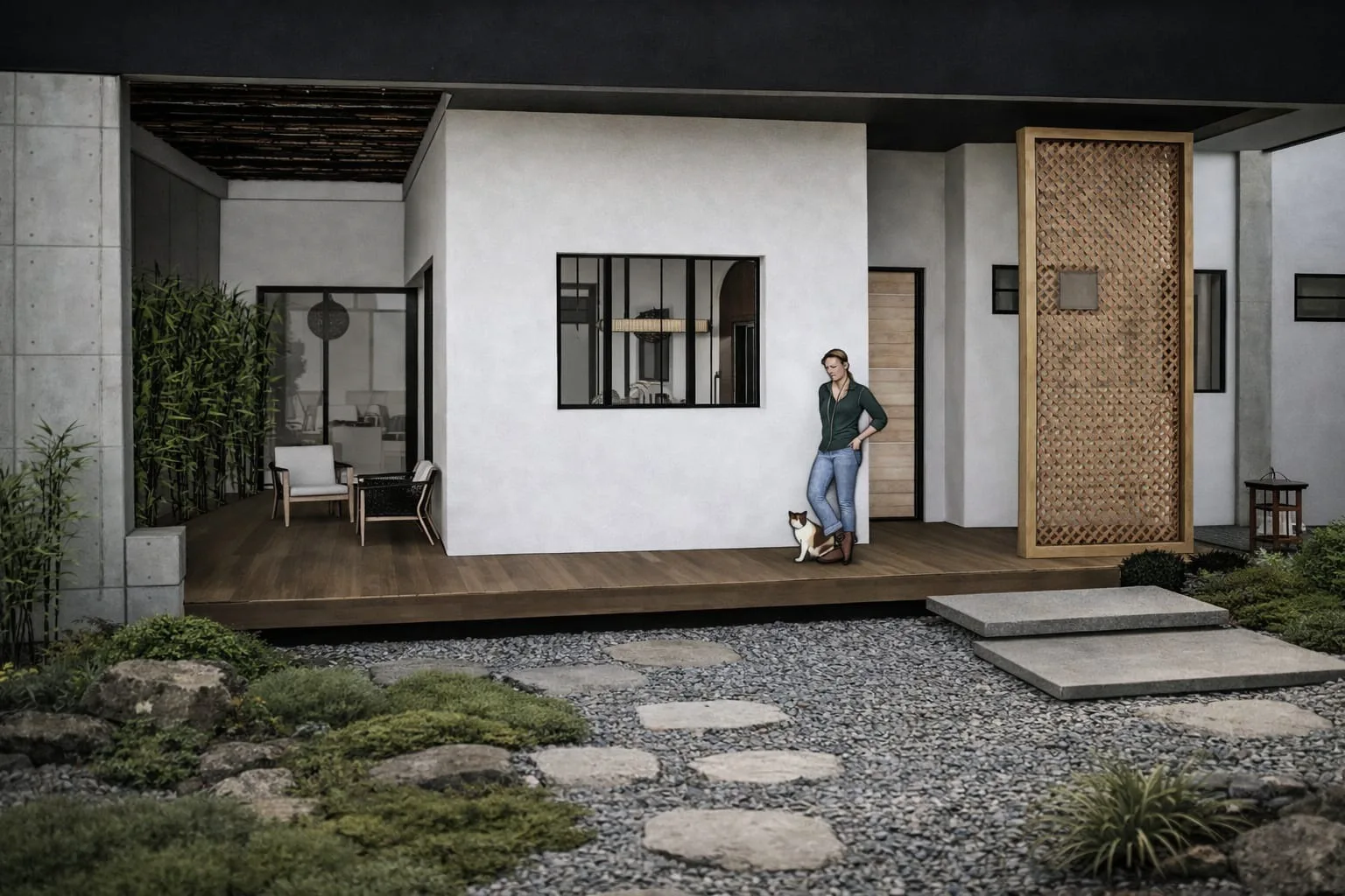 The house was designed as a relationship between space, light, and inner quiet, inspired by Japanese and Zen culture. Filtered light defines a daily rhythm of dwelling and contemplation, shaping the sense of time within the home. The building’s placement creates inward gathering through front and rear courtyards designed as calm patios that allow pause and meditation, with emptiness acting as an organizing element. This is a simple, mindful architecture that creates a spiritual experience through light and material. A restrained palette of natural materials repeats throughout the house, forming a calm, visually quiet environment. Material is a tool for experience — a gentle meeting of spirit, feeling, and meaning