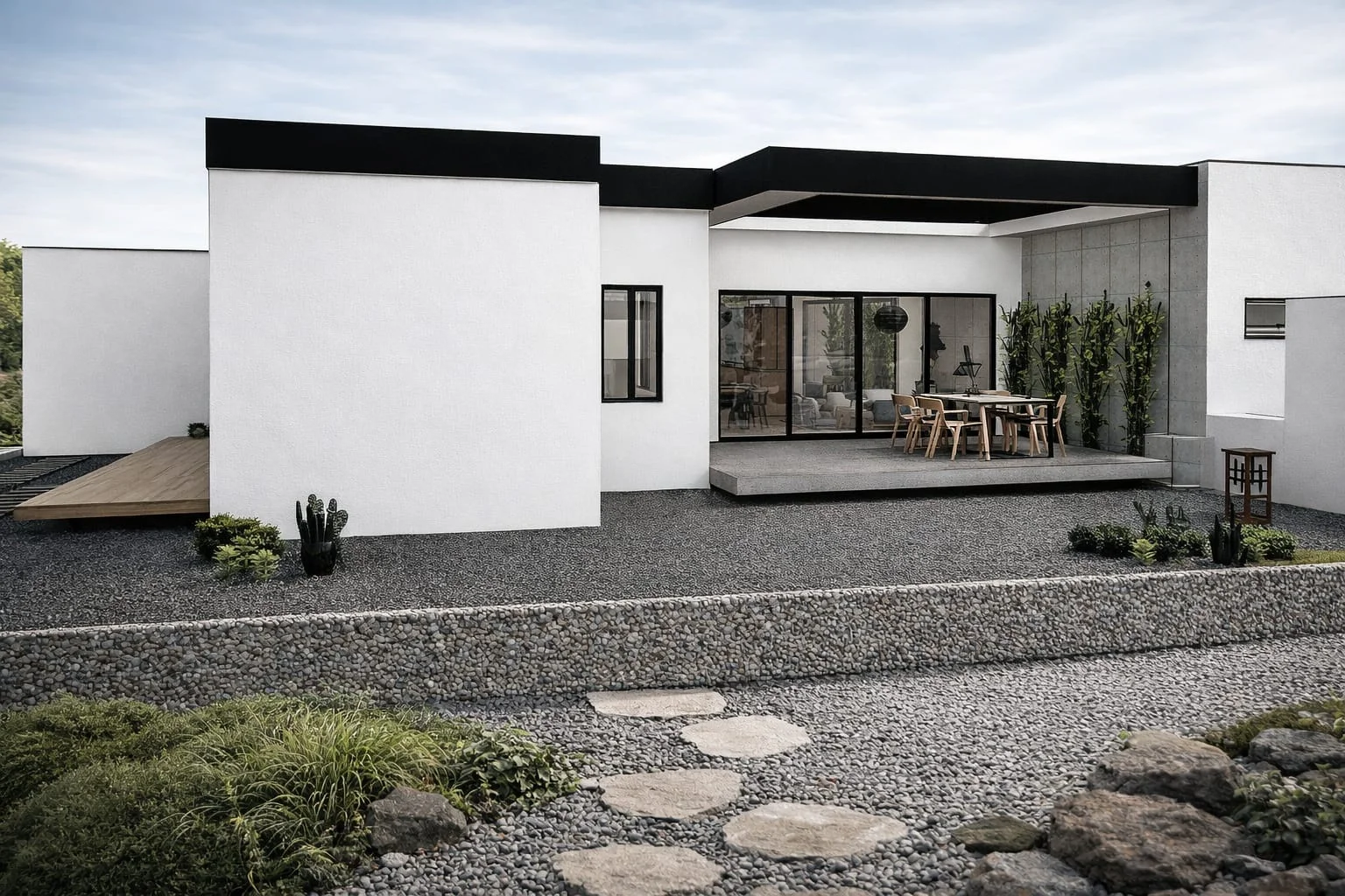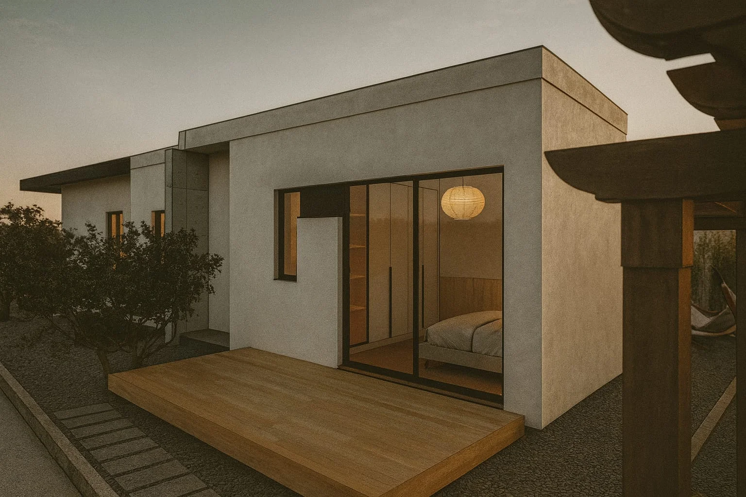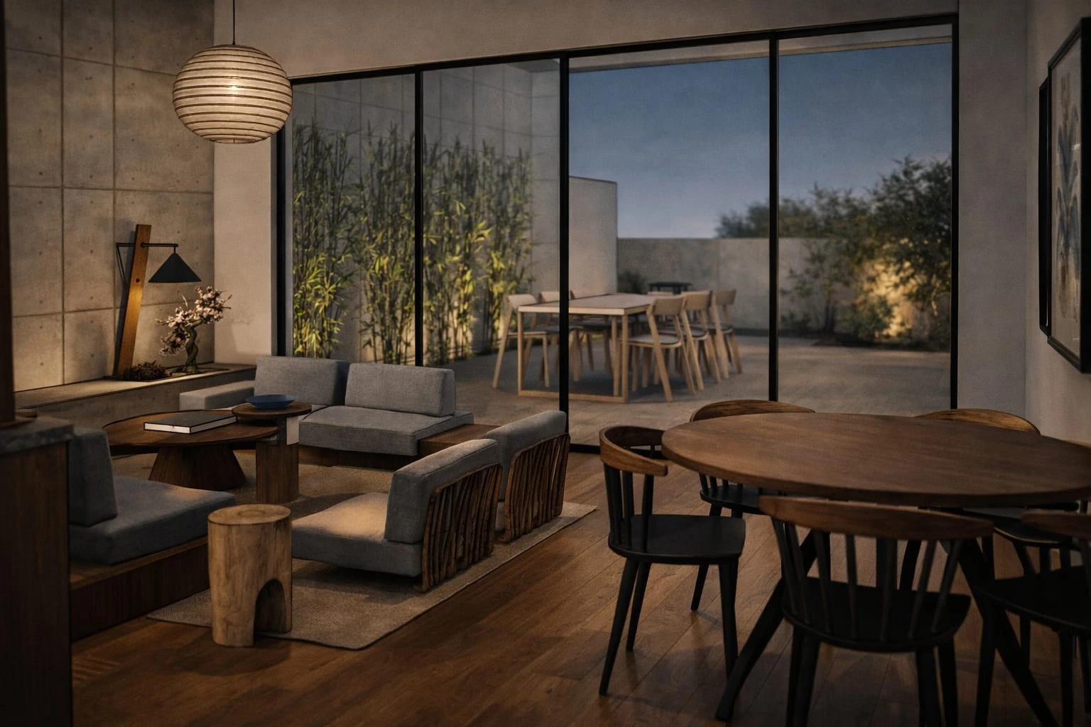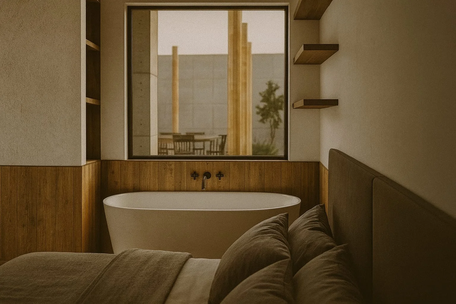 The house was designed as a relationship between space, light, and inner quiet, inspired by Japanese and Zen culture. Filtered light defines a daily rhythm of dwelling and contemplation, shaping the sense of time within the home. The building’s placement creates inward gathering through front and rear courtyards designed as calm patios that allow pause and meditation, with emptiness acting as an organizing element. This is a simple, mindful architecture that creates a spiritual experience through light and material. A restrained palette of natural materials repeats throughout the house, forming a calm, visually quiet environment. Material is a tool for experience — a gentle meeting of spirit, feeling, and meaning