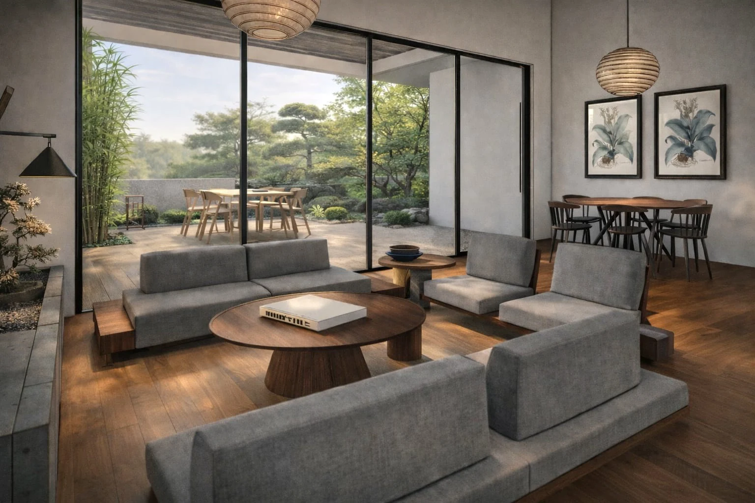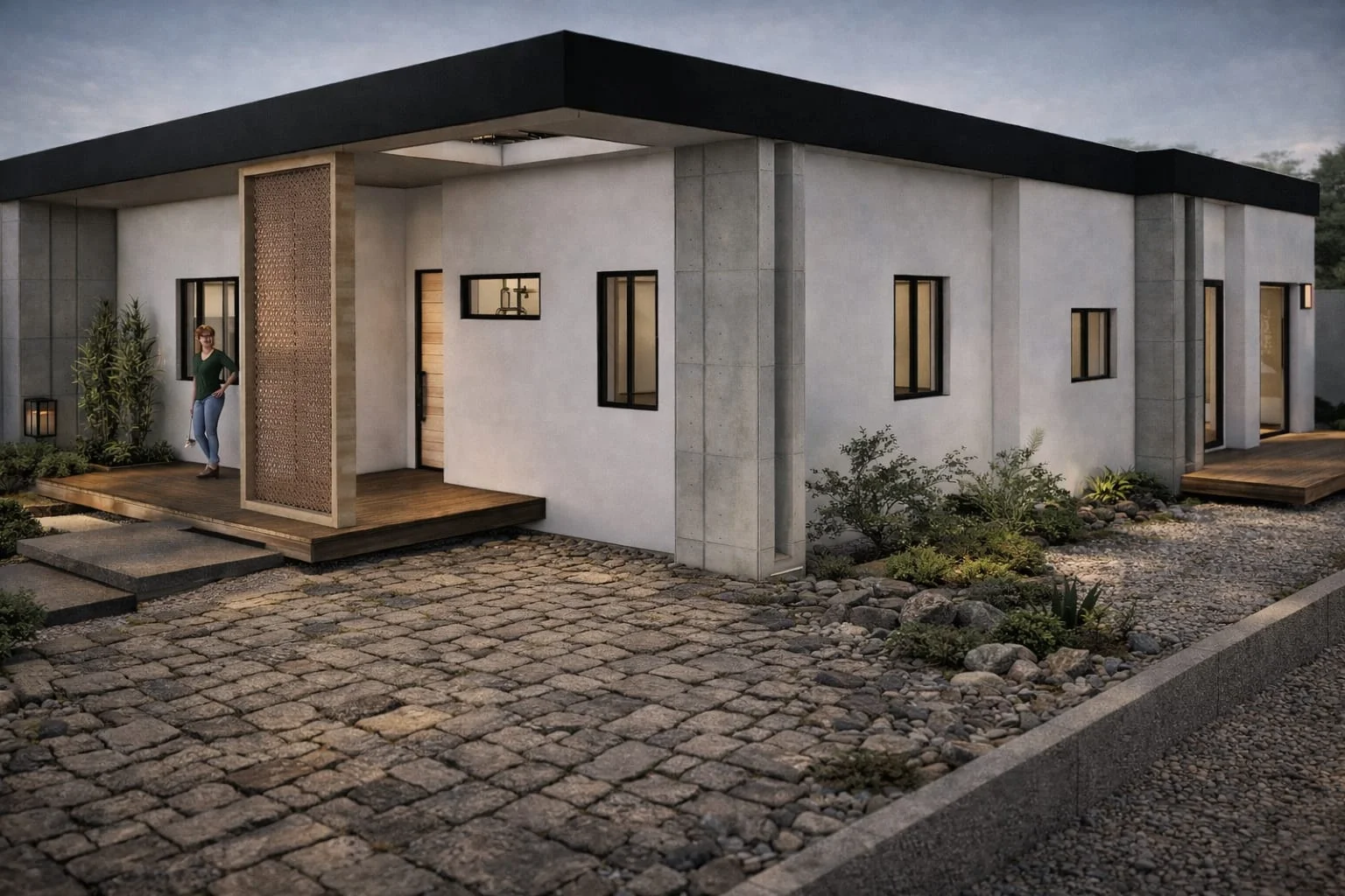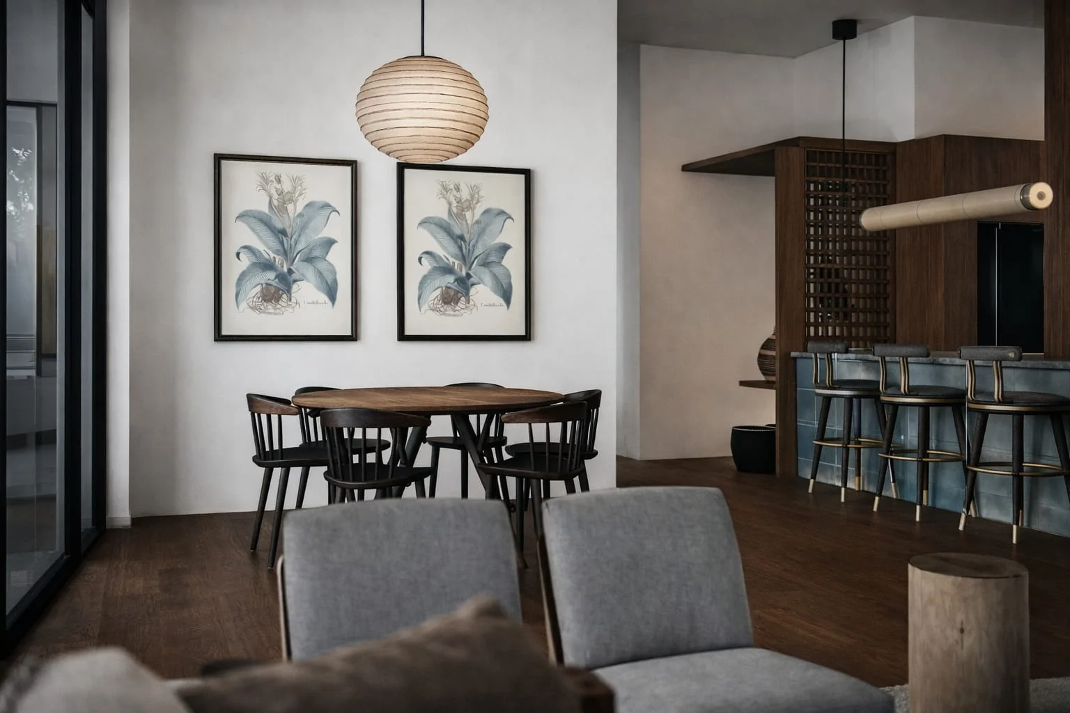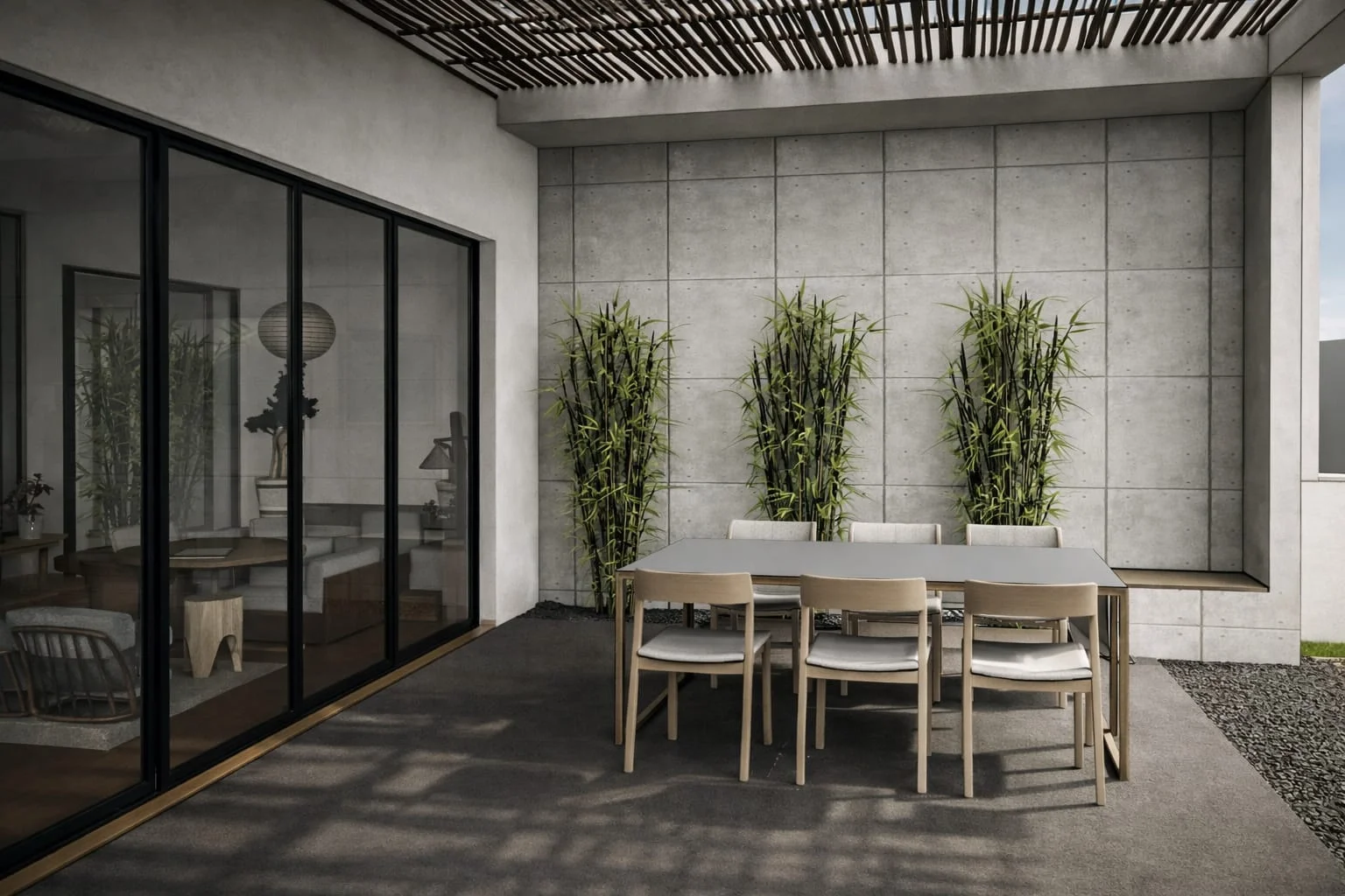 The house was designed as a relationship between space, light, and inner quiet, inspired by Japanese and Zen culture. Filtered light defines a daily rhythm of dwelling and contemplation, shaping the sense of time within the home. The building’s placement creates inward gathering through front and rear courtyards designed as calm patios that allow pause and meditation, with emptiness acting as an organizing element. This is a simple, mindful architecture that creates a spiritual experience through light and material. A restrained palette of natural materials repeats throughout the house, forming a calm, visually quiet environment. Material is a tool for experience — a gentle meeting of spirit, feeling, and meaning